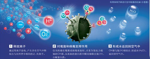 夏普空氣凈化器搭載獨(dú)有的“凈離子群”空間凈化技術(shù),這項(xiàng)技術(shù)通過(guò)等離子放電產(chǎn)生出與自然界相同的正負(fù)離子,僅當(dāng)附著在霉菌或病毒表面時(shí),才形成強(qiáng)氧化力的OH基,從表面的蛋白質(zhì)中瞬間抽取出H,分解蛋白質(zhì)。OH基與H基結(jié)合,形成水返回到空氣中。