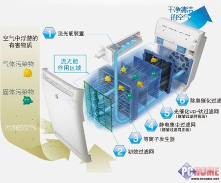 空氣凈化器的工作原理為:機器內的微風扇使室內空氣循環流動,污染的空氣通過機內的空氣過濾器兩次過濾后將各種污染物清除或吸附,然后通過出風口的負離子發生器將空氣不斷電離,產生大量負離子,被微風扇送出,形成負離子氣流,達到清潔、凈化空氣的目的,從而給人們提供一個干凈、清新、健康的空氣環境。