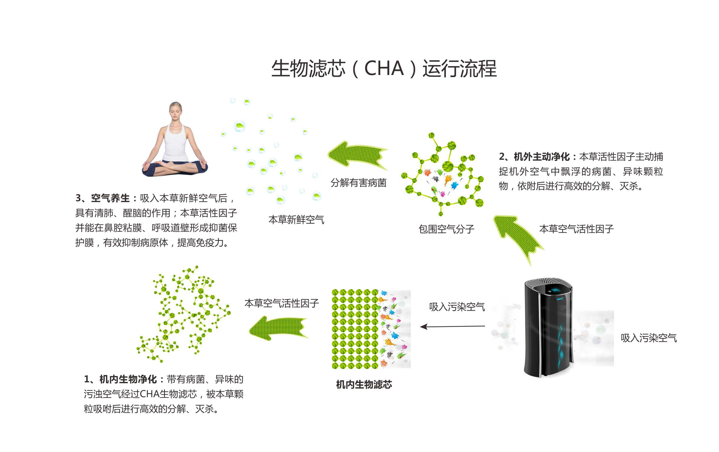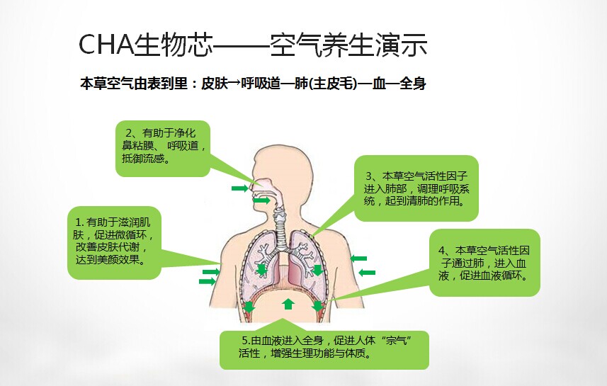 據彭康教授介紹,CHA本草凈化技術具有三大先進功效:一、生物凈化更高效:傳統空氣凈化是被動式吸附凈化,有害微生物被吸附在HEPA等物理濾網上,相當于“垃圾筒”式的收集,沒有被殺死。本草空氣凈化具有生物殺菌消毒功能,空氣中有害微生物進入CHA生物濾芯,不僅被過濾,而且被本草活性成份殺死。二、主動式凈化更徹底:傳統空氣凈化器凈化工作全部在機內,是被動的,而本草空氣凈化過濾出來的空氣,因含有中草藥活性揮發成份,在空中還可主動消毒,凈化更加徹底。三、空氣養生更健康:本草空氣凈化散發出來的空氣含有天然植物營養成分的活性空氣因子,接觸皮膚,進入鼻粘膜、呼吸道、肺部,在局部形成屏障可阻滯有害物質的吸入,并有利于人體健康。